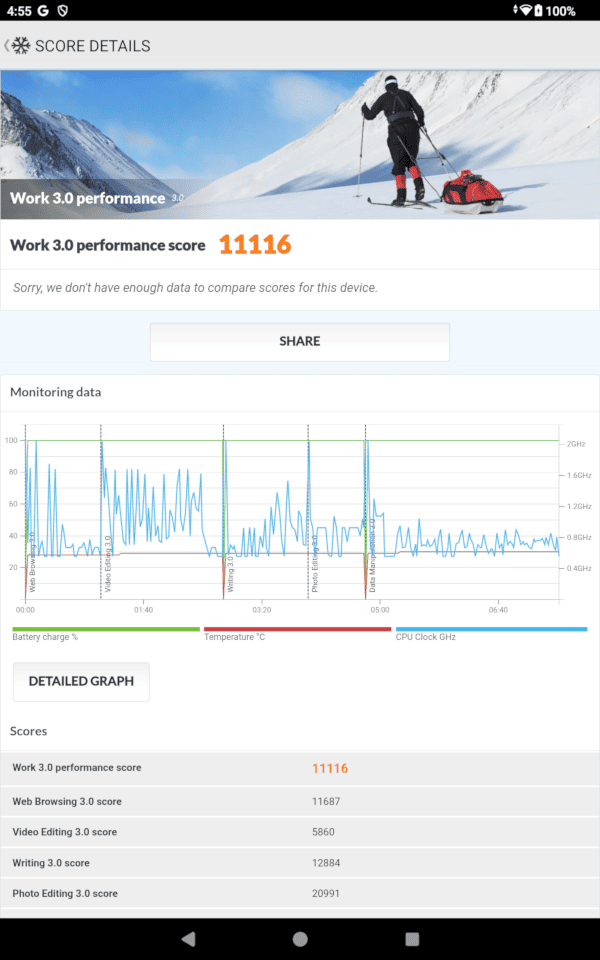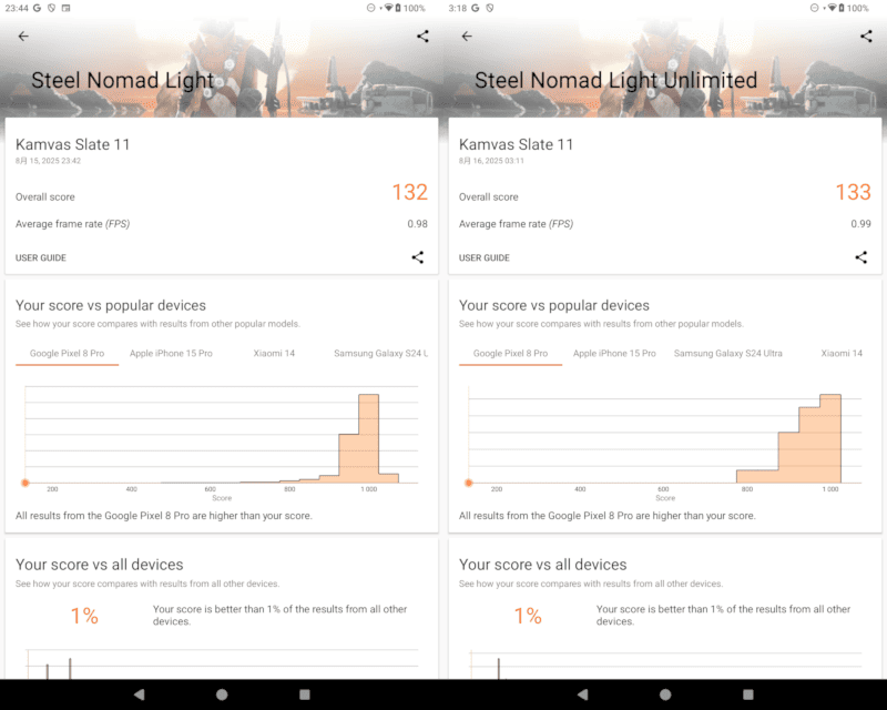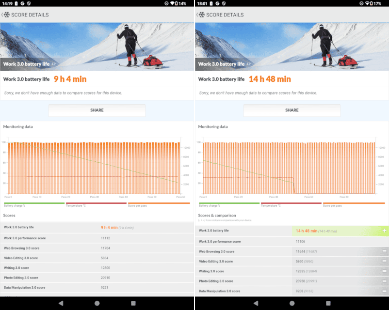 バッテリー持ちが良いように見えますが、前述の通り、最大輝度が350nitsとやや低めなことが大きく影響していますね。