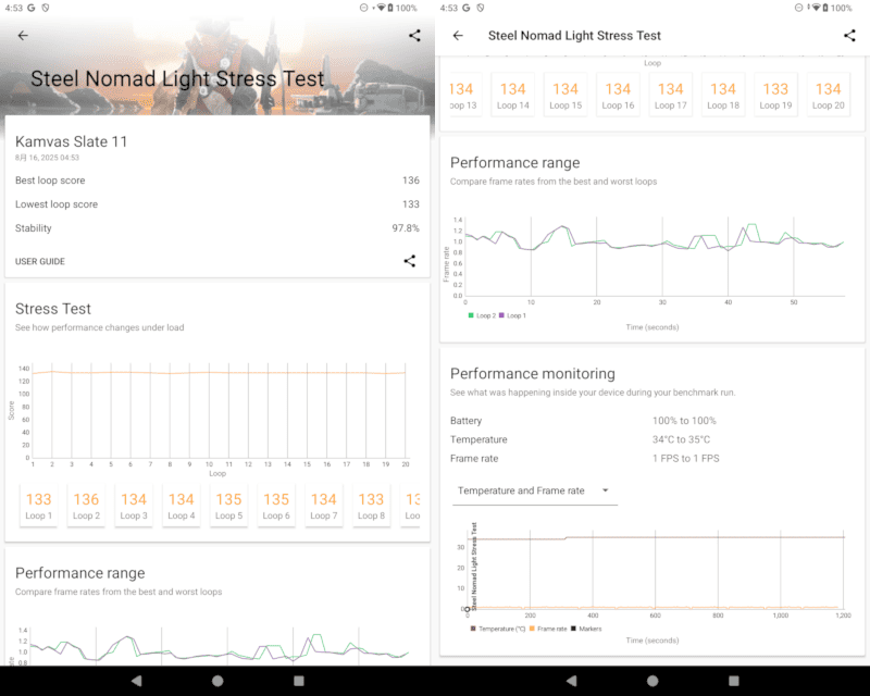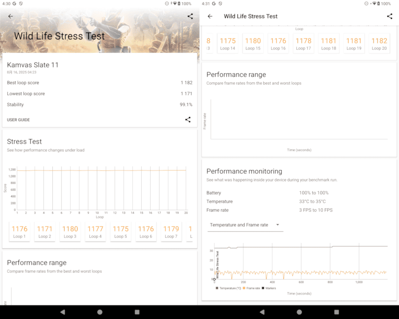 ストレステスト時の温度変化も33度から35度とゆるやかです。