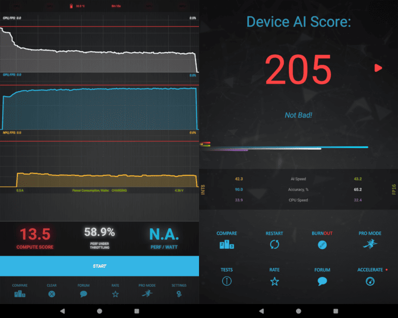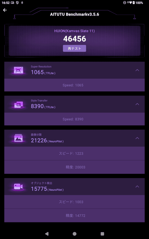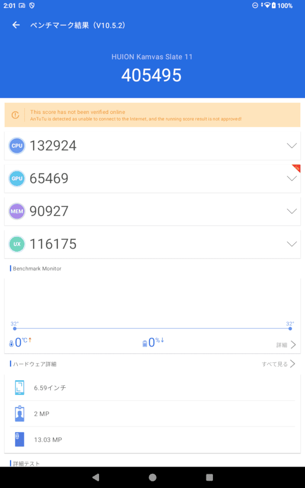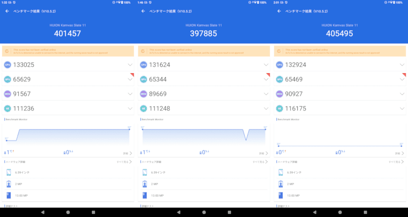 AnTuTu(v10)のスコアは総合40.5万点、CPU13.3万点、GPU6.5万点。3回連続計測でもスコアは下がっていません。むしろ、なんで上がってるの…?