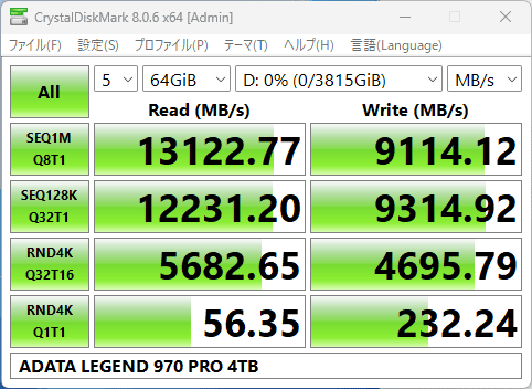 シーケンシャルでリード13,408MB/s、ライト9,690MB/sを記録。高速ではありますが、仕様には届いていません。