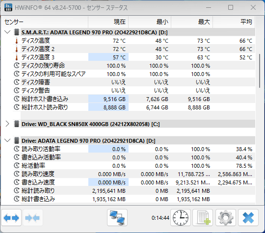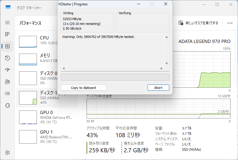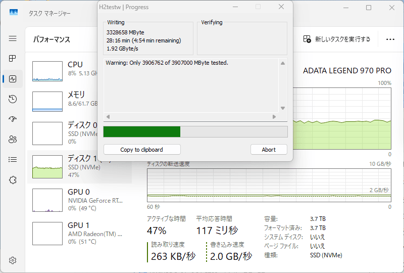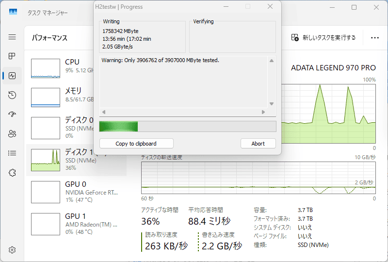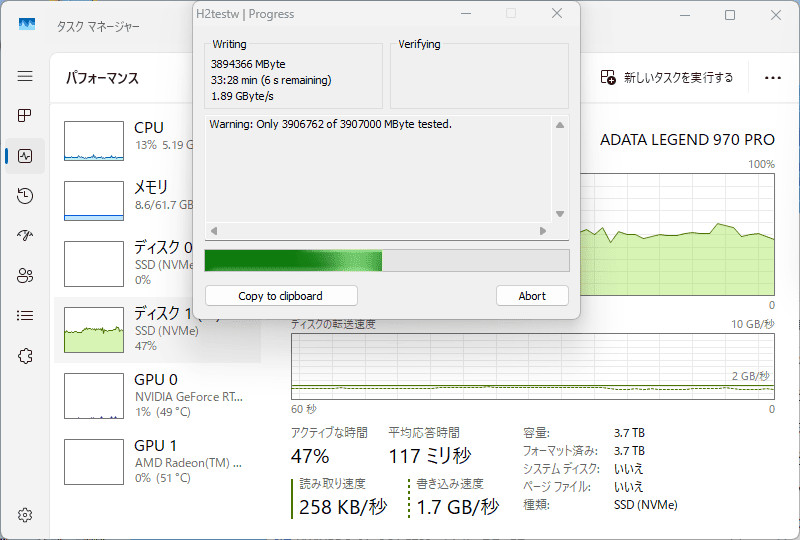 その後は特に高負荷となることもなく、負荷50%前後、書き込み速度も2.0GB/s前後で安定。