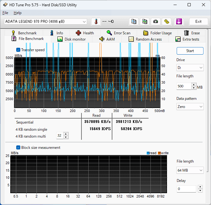 ライトは1MB、リードは4MBからピーク速度に。他のSSDだとライト256~512KB、リード1MBくらいからピーク速度となるので、細かいファイルは苦手っぽい。