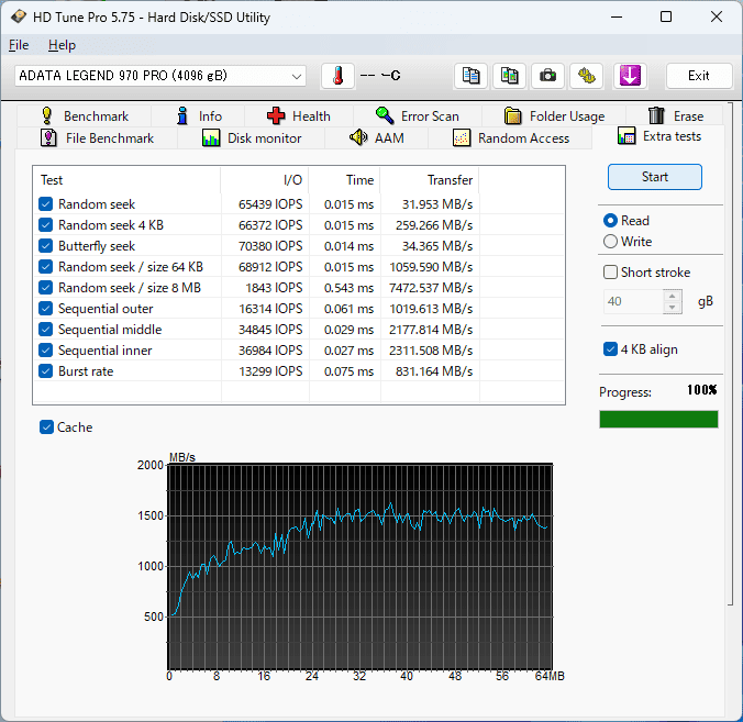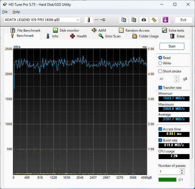 HD Tune Proでは読み込みは全域ほぼフラットで、平均2,200MB/s。
