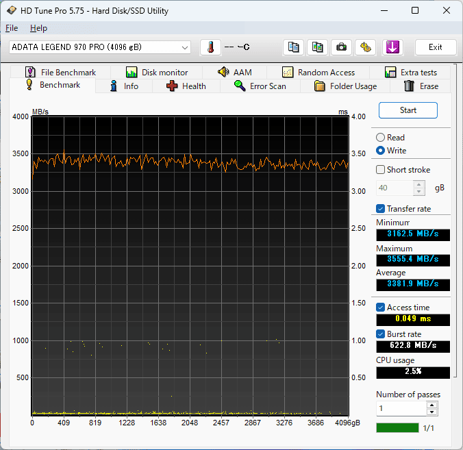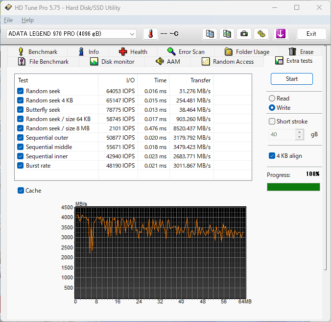 書き込みは読み込みより安定していて、おおむね3,300MB/sを維持。