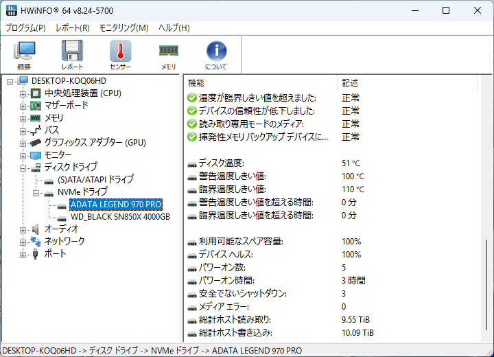 CrystalDiskInfoの情報です。規格容量は4096.7GB。予備領域はないようです。