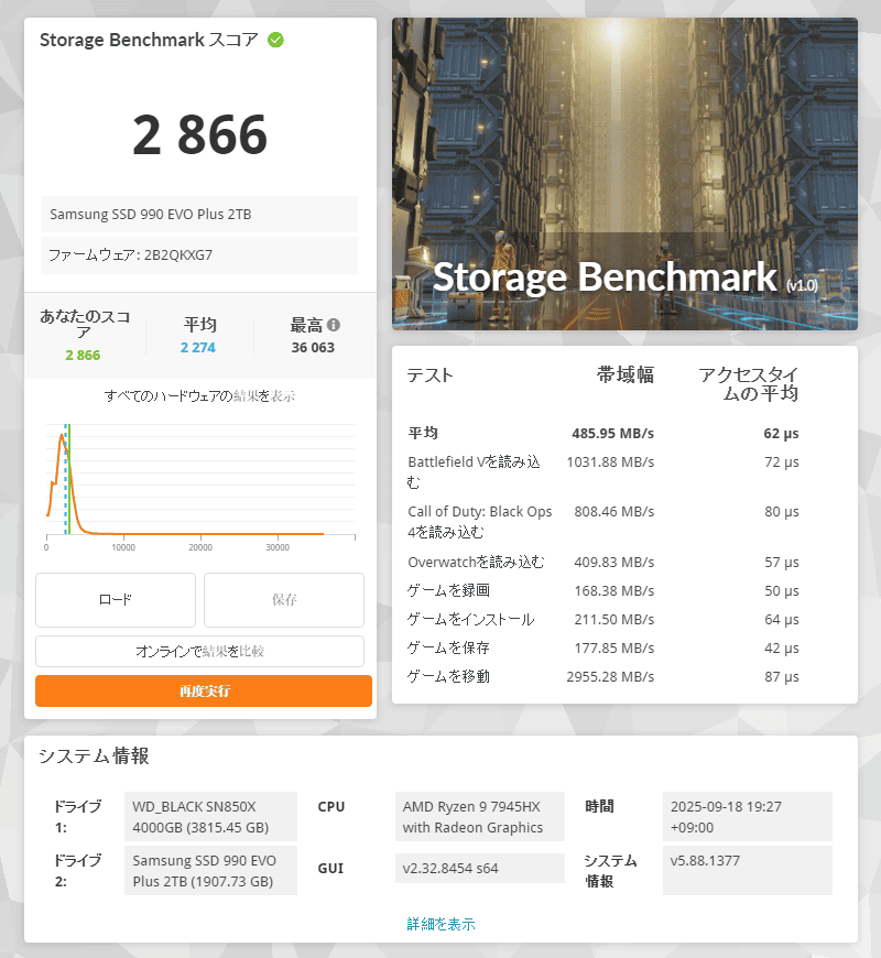 3DMarkは2866ポイント。