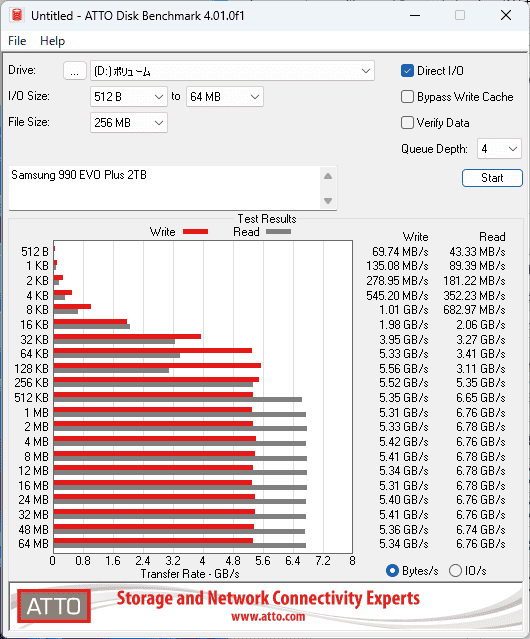 ATTO Disk Benchmarkはファイルサイズが小さなファイルにおけるスループットを計測するベンチマークです。
