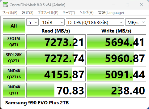 シーケンシャルでリード7,273MB/s、ライト5,694MB/sを記録。リードは仕様通りの数値が出ています。