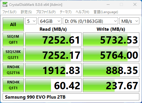 ライトはQ32T1だと5,960MB/sまで出ていますが、仕様(6,300MB/s)に届いていません。