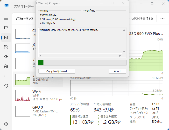 全域書き込みの速度を計測するh2testwは、2.6GB/sスタート。なかなかに好調な滑り出しです。