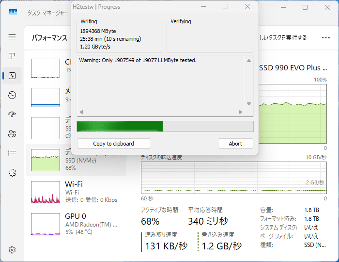 200GB(10%)を超えたあたりで付近で負荷が40%→60%に。書き込み速度も1.2~1.3GB/sに落ち込みました。