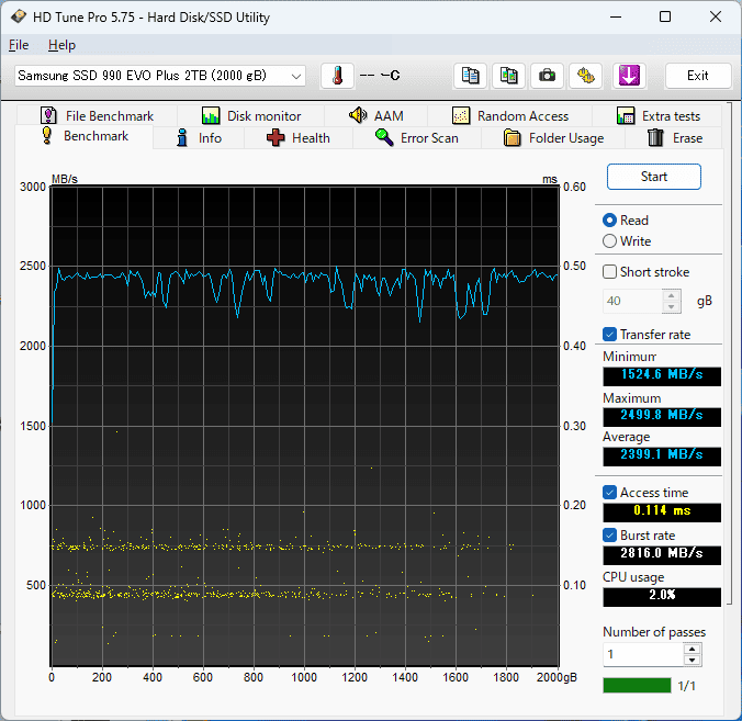 HD Tune Proでは全域ほぼフラットで、平均2,399MB/s。
