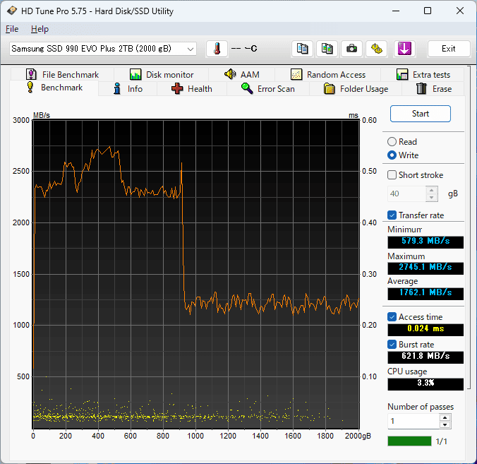 4TBモデルでも400GB(10%)を超えたあたりから同様だったので、「990 EVO Plus」のSLCキャッシュは10%と考えてよさそうです。