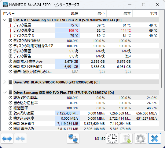どちらも3種類の温度センサーが見えています。一番高いのがコントローラー温度で、残り2つがNAND温度です。