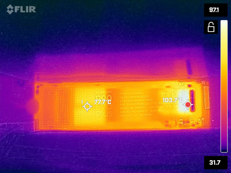 ファンの風が当たる程度でも70度程度になるので、エアフローや冷却がある程度しっかりしていれば、十分に力を発揮できるSSDと言えるでしょう。