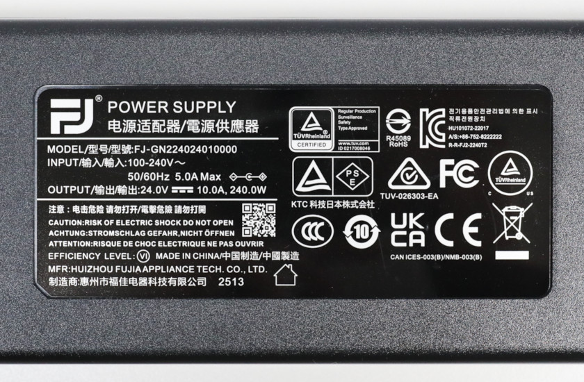 電源アダプタは24V/10A(=240W)出力。さすが超高輝度モニター、消費電力も高そうです。