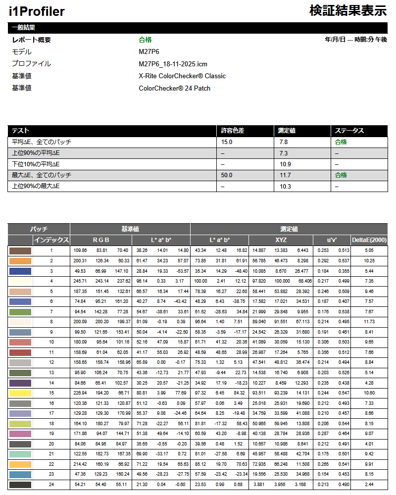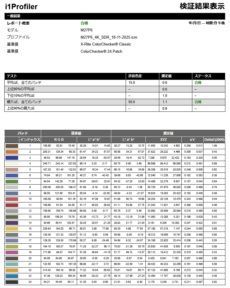 i1Display Proによる色精度。補正後の結果ですが、驚異の平均ΔE=0.6を叩き出しました。
