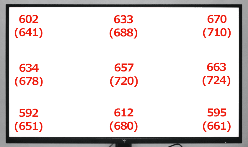 HDR時・明るさ100での各ポイントの輝度。カッコ内は輝度計での計測。