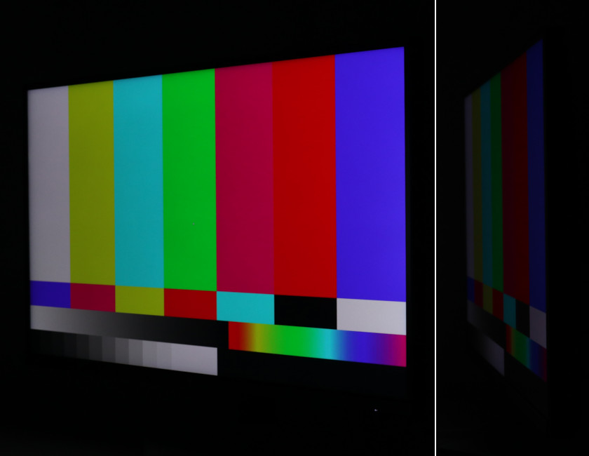 が、斜めから見ると光漏れが起きていて(ハロー現象)、有機ELのような完全な黒ではないことが分かります。