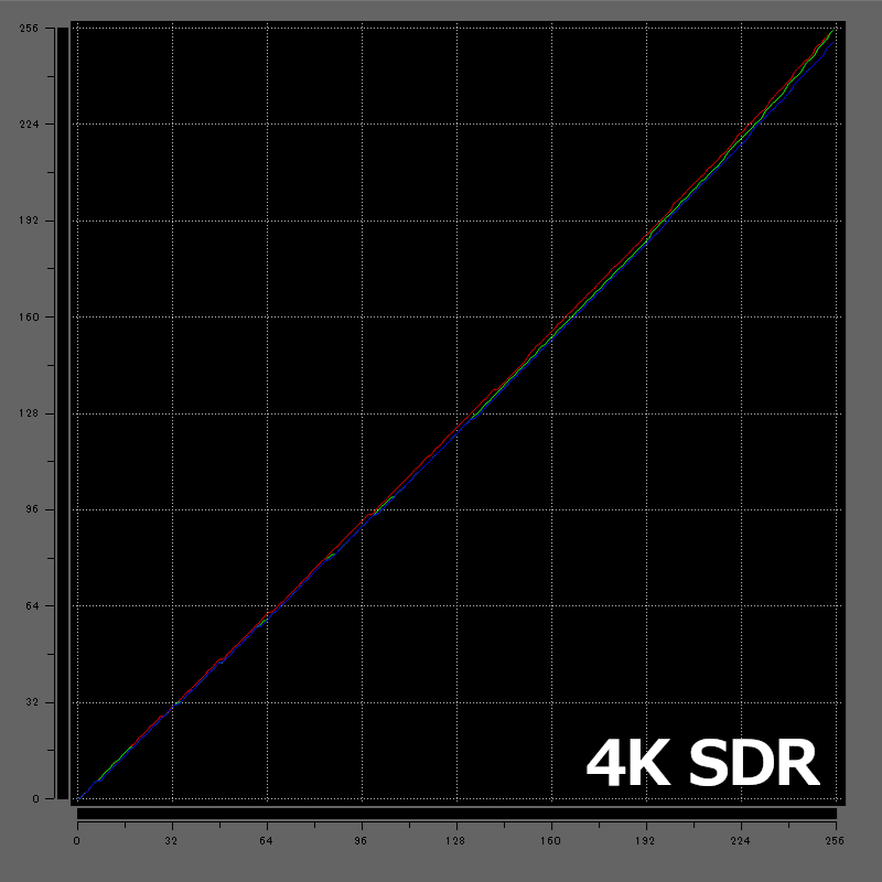 SDRでは予想以上に見事な直線を描いていますが、HDRではやや弧を描く形となり、中間付近ではやや強く発色する傾向にあるようです。