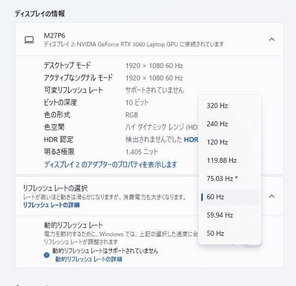 「M27P6」の最大リフレッシュレートは320Hz(FHD時)。