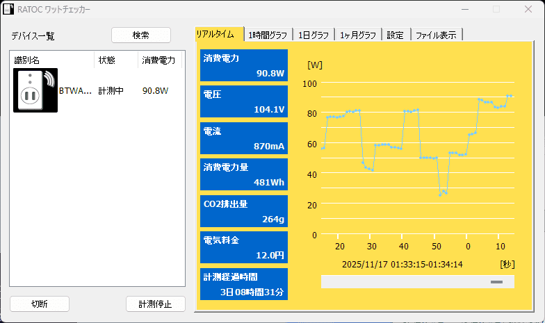 実験的に消費電力も計測してみました。