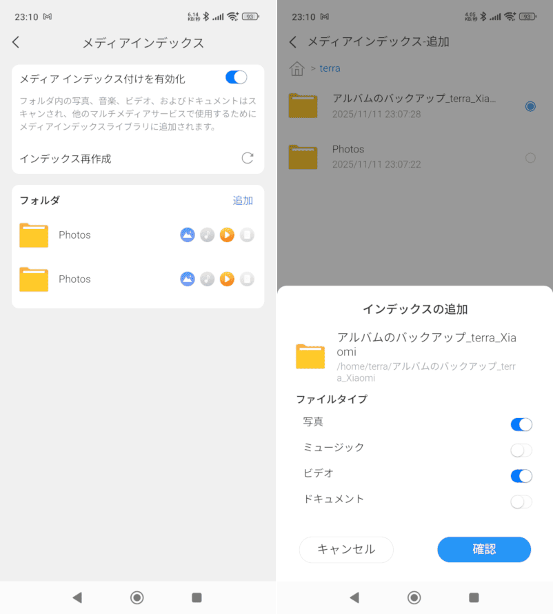 というわけで、手動でメディアインデックスの対象フォルダーに追加。これをしないとPhotosアプリなどで表示されません。