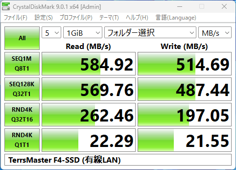 転送速度はリード585MB/s、ライト514MB/s。ほぼ5GbEの限界まで出ています。