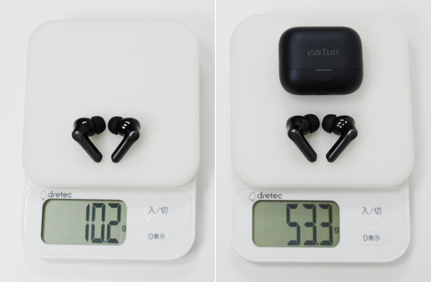 重さは本体が10.2g(片方5.1g)、ケース込みで53.3g。