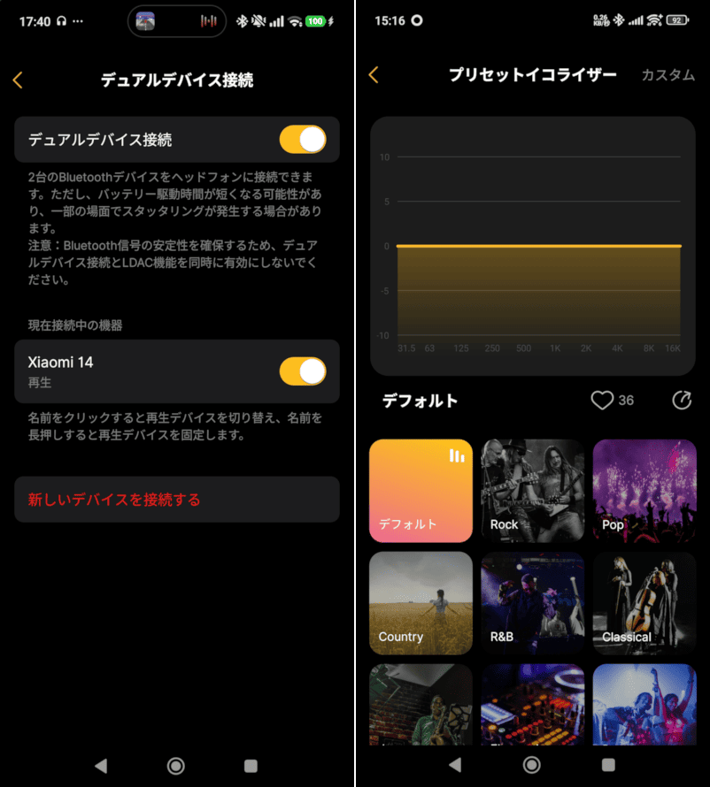 デュアルデバイス設定とイコライザ。