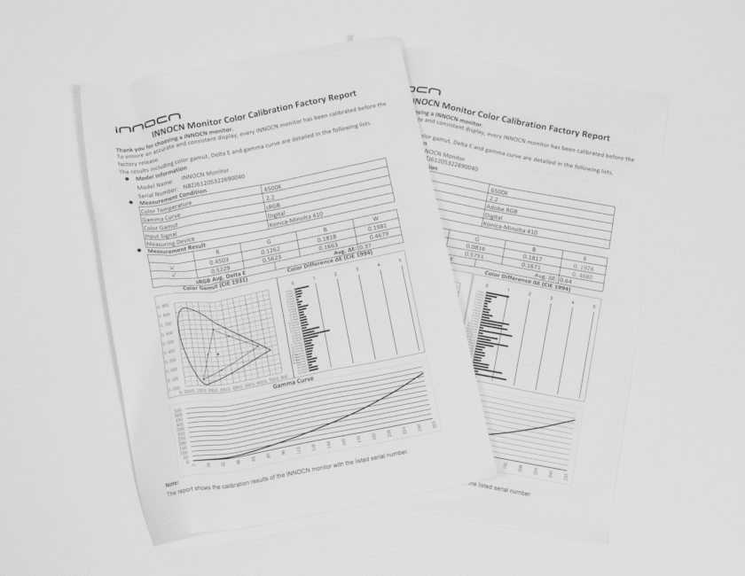 キャリブレーションレポートは一台ずつのキャリブレーション結果(sRGBとAdobeRGB基準での計測)を記載。
