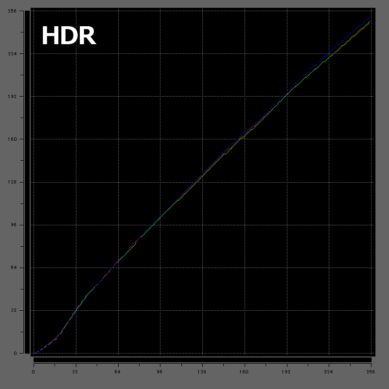SDRでは直線的にずれていきますが、HDRではRGBがほぼ一致。暗い部分ではややブレがあるものの、綺麗な直線を描いています。