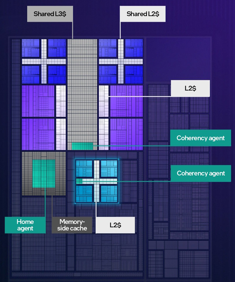 上の画像はCPUタイルの内部構造ですが、真ん中の紫がPコア、上の青がEコア、下の水色がLP Eコアです。