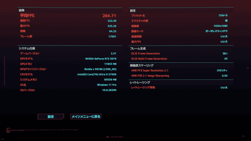 サイバーパンク 2077のベンチマークモードで計測。
