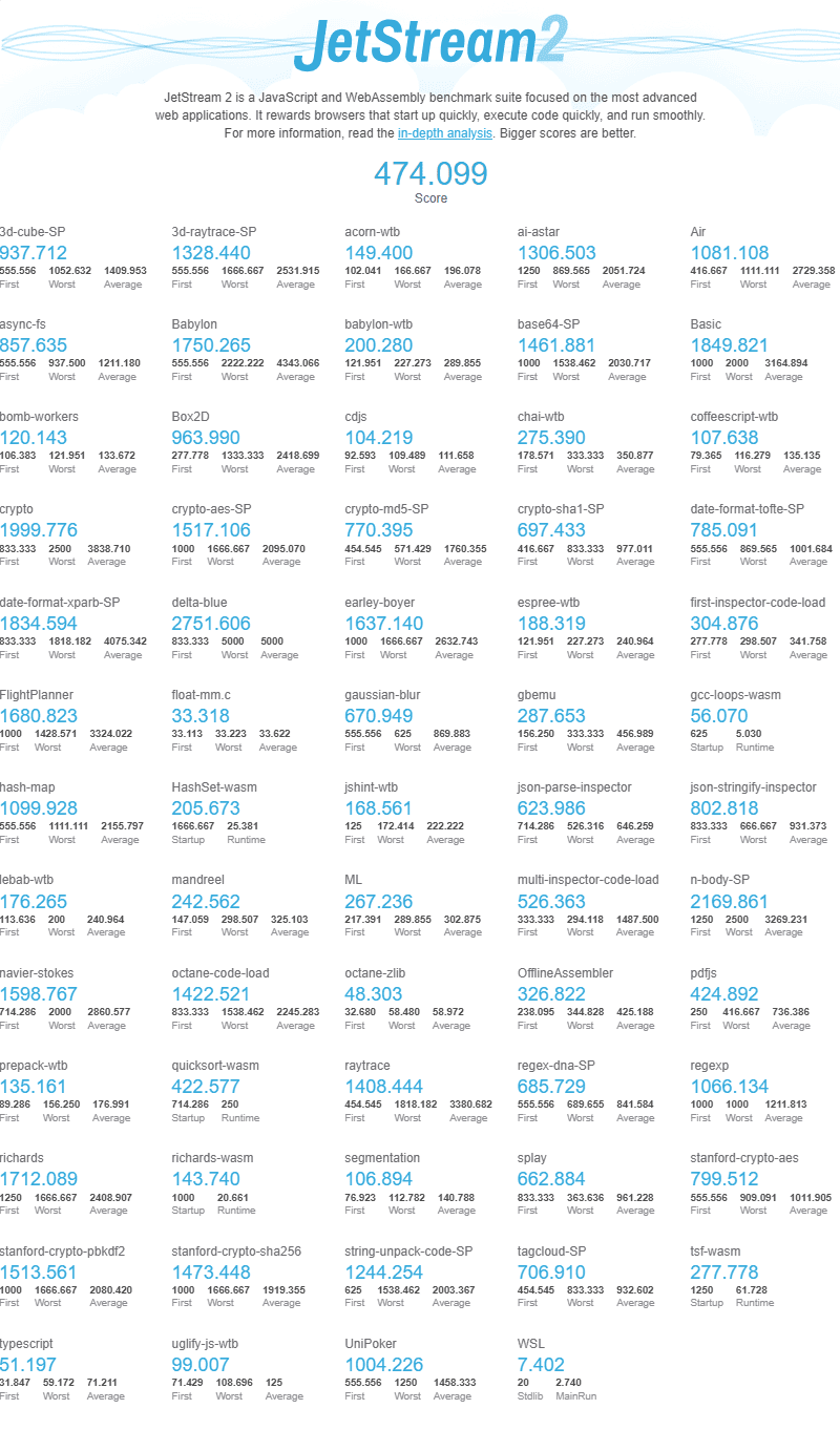 | ブラウザ | jetstream2 | 474.099 |