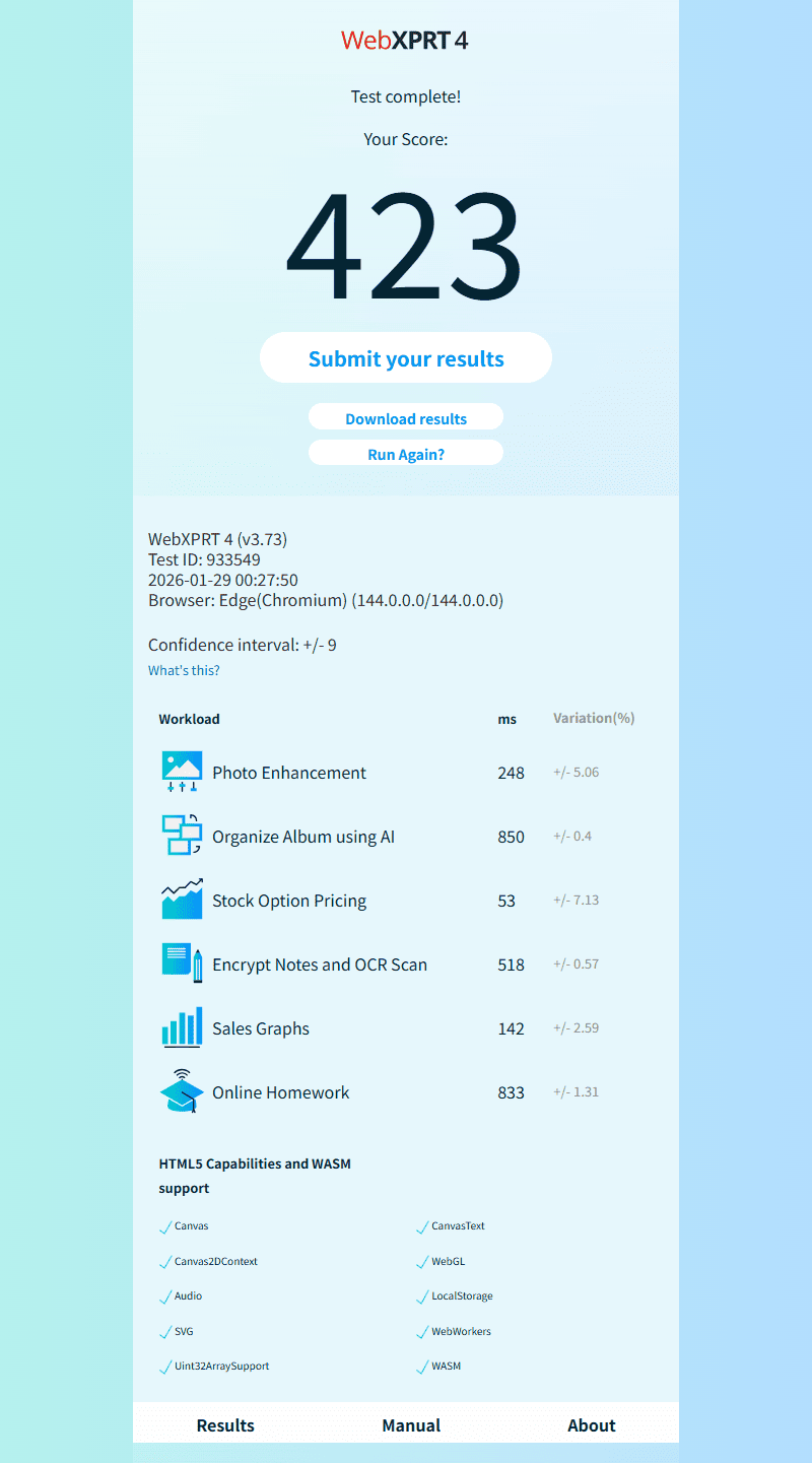 | WebXPRT4 | 423 | |