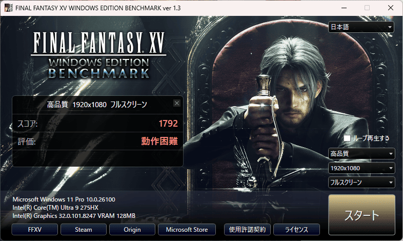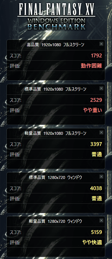 | FF XV(DX11) | 1920・高 | 1792 動作困難 |