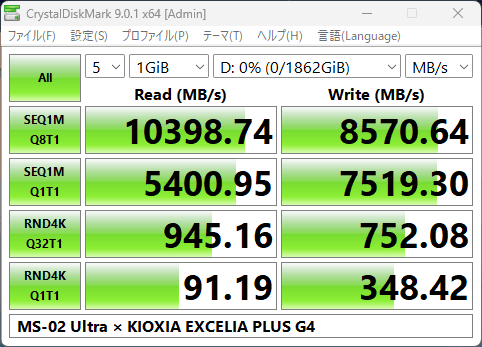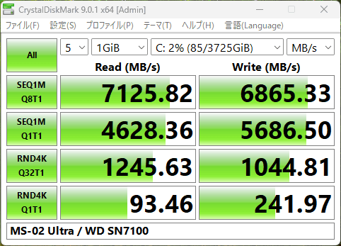 この通り、Gen5 SSDの速度が出ました。