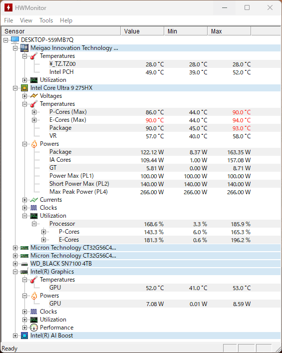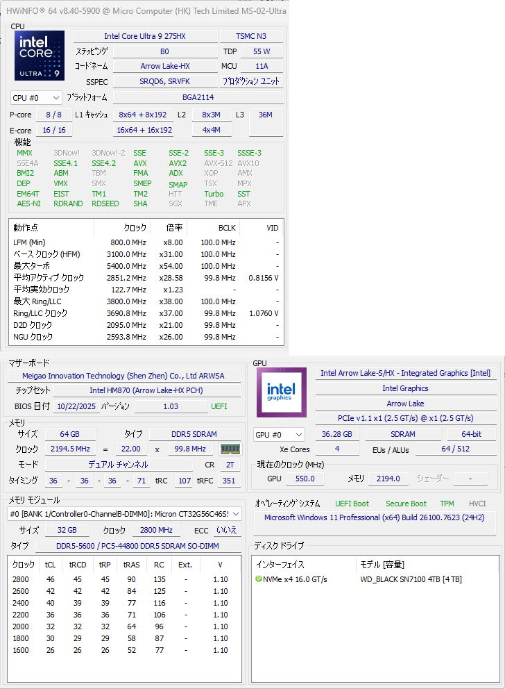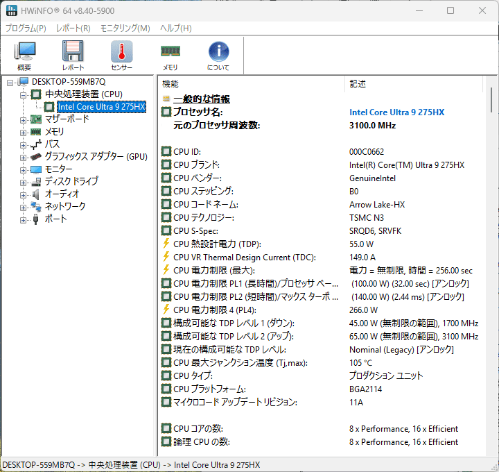 レビュー機の搭載CPUはCore Ultra 9 275HX。